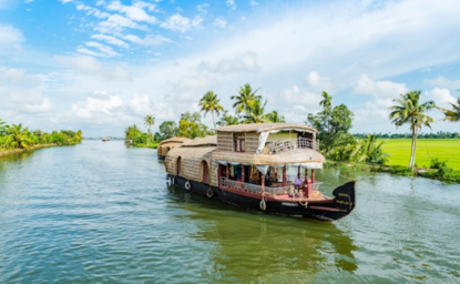 Glide through the tranquil backwaters of Kerala in a traditional houseboat. Surrounded by coconut palms.